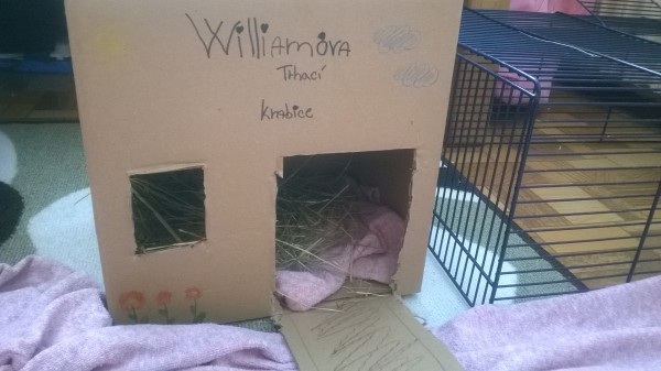 Moje krabice je vystlaná kouskem starého prostěradla a trochou sena.